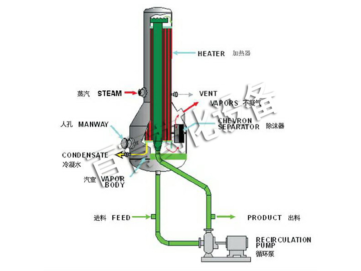 需濃縮的料液由泵送入加熱管頂部,沿著加熱管內壁形成液膜向下流動。在這個過程中,由于管外的加熱,管內液膜開始沸騰并部分蒸發(fā)。在列管下部分及其下游的分離器中,剩余的液體和蒸汽得以分離。
