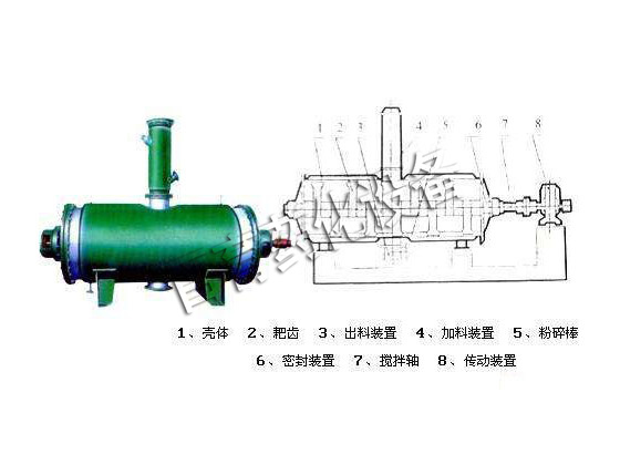 被干燥物料從殼體上方正中間加入,在不斷正反轉(zhuǎn)動的耙齒的攪拌下,物料軸向來回走動,與殼體內(nèi)壁接觸的表面不斷換新,受到蒸汽的間接加熱,耙齒的均勻攪拌,粉碎棒的粉碎,使物料內(nèi)的水份氣化,在真空系統(tǒng)的作用下,使被干燥物料內(nèi)部水份和表面水份有利的排出,氣化的水份經(jīng)干式除塵器、濕式除塵器、冷凝器,從真空泵出口處放空。